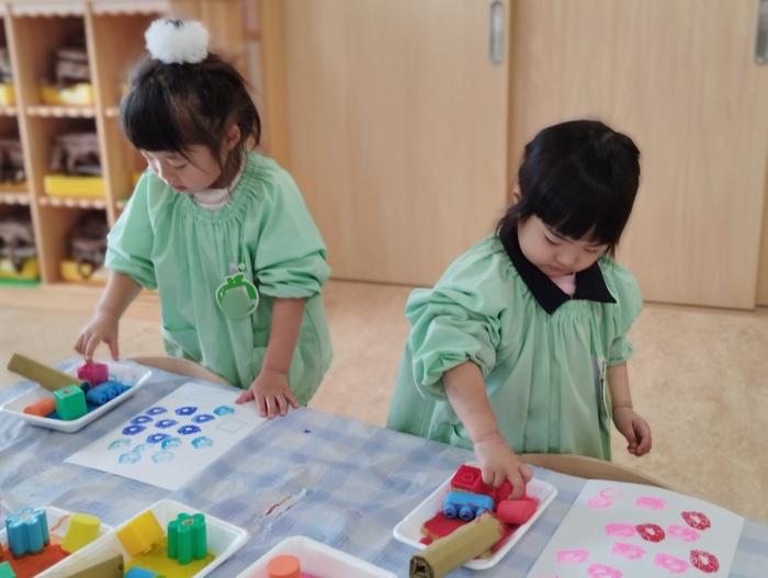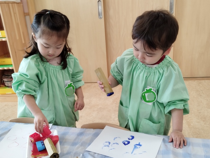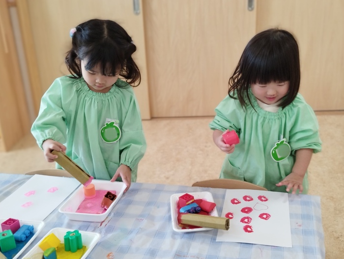 ひよこ組では、絵の具と様々なおもちゃなどを使って スタンプ遊びを楽しんでいました。 子ども達は自分で好きな色や形を選んで、画用紙にペタペタとスタンプして大喜び💛 夢中になって取り組む姿がとても微笑ましかったです(*^_^*) | ||