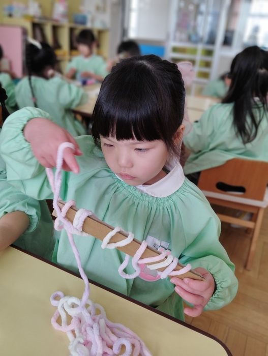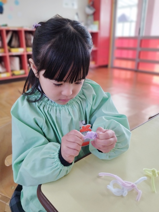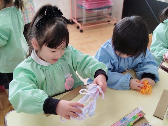 年少組さんは作品展に向けた制作に取り組んでいました。 自分で好きな色の毛糸やモールを選んで一生懸命作っていました。 どんな作品に仕上がるのか、完成が楽しみですね☺ | ||