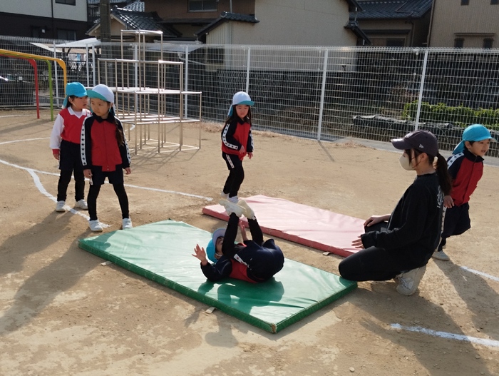 あひる組と年中組は体育遊びで元気に運動を楽しみました。 年中組は今まで練習してきたマット運動や鉄棒を組み合わせた「体育ローテーション」に挑戦! 前転や後転、前回りや逆上がりなど、次々と技を披露して、楽しそうに走る姿が印象的でした☺ | ||