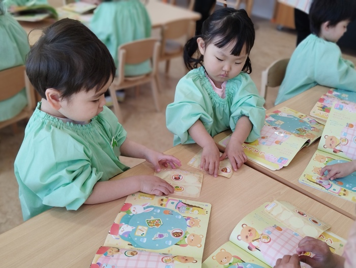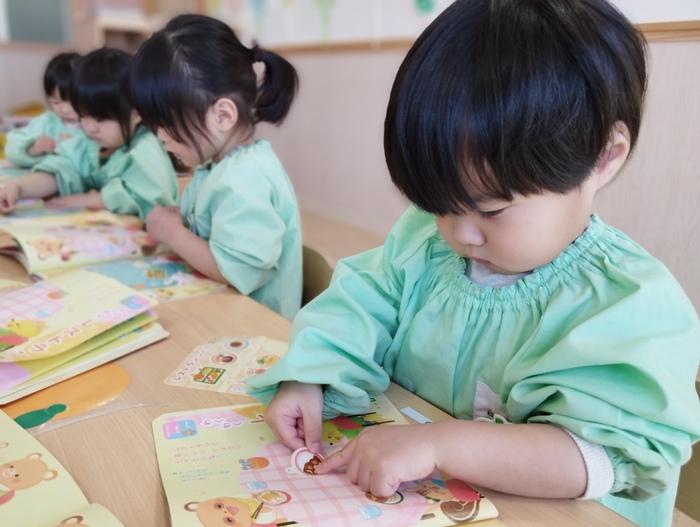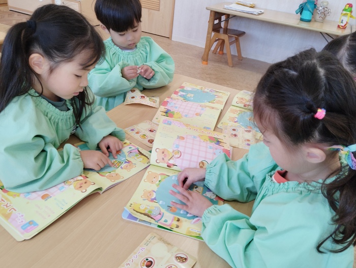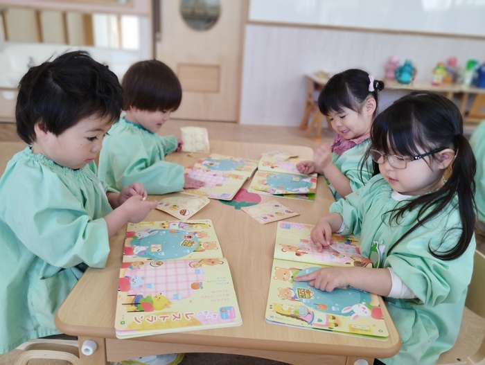 ひよこ組ではみんなで絵本を読みながら 季節の移り変わりを感じたり、 シール貼りを楽しんでいました🍀 春の訪れを感じる内容で、 子ども達は目を輝かせながらページをめくっていました。 シール遊びのページもあり、レストランの店員さんになりきって、 動物たちに「はい、どーぞ!」「おいしいよ!」など おもてなしする姿がとても可愛らしかったです(*^_^*) | ||